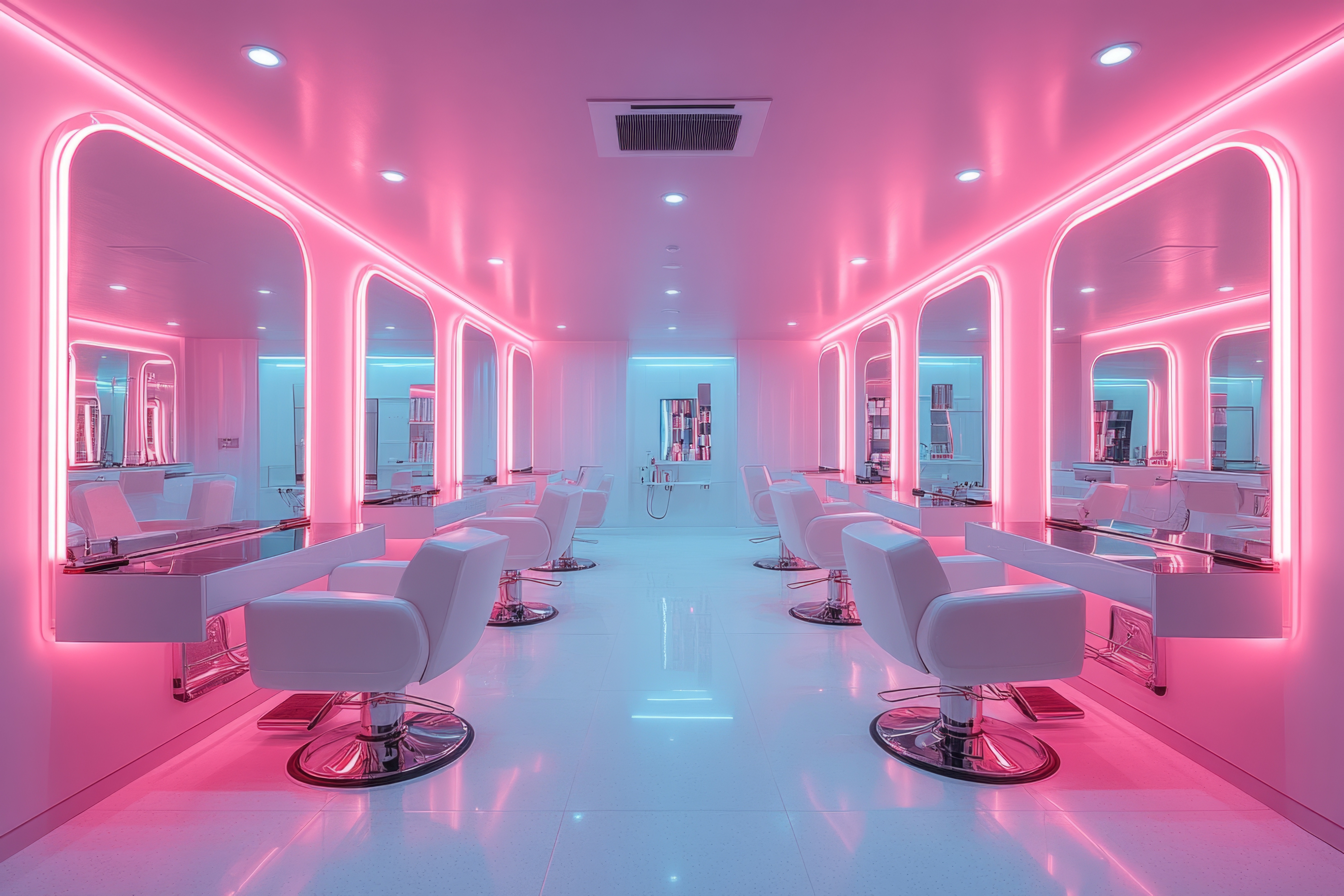 modern hair salon interior design featuring pink and turquoise neon lights, white furniture, and large mirrors